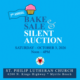 Mark your calendar for Saturday, October 3, 2026 as St. Philip Lutheran Church of Myrtle Beach will hold its second annual Bake Sale and Silent Auction. Held from noon until 4:00 pm in the Fellowship Hall at the church, the event will feature hundreds of fresh-baked items such as specialty cakes, pastries, cupcakes, pastries, cookies, assorted pies and designer cakes. Last year’s sale brought together dozens of volunteers who contributed more than 150 items to the event. The silent auction is a highly anticipated event which will bring together a varied collection of items, experiences, and services. Last year’s offerings included jewelry, gifts, dining certificates, household items, travel vouchers and more. Bidding starts at noon and will continue until 3:45pm. Winners will be contacted in person or by phone at the conclusion of the event.