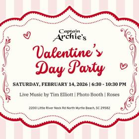 Celebrate Valentine’s Day at Captain Archie’s with a night of live country music from Tim Elliott, photo ops, and roses for that special touch. Bring your sweetheart, grab a drink, and enjoy great music and good company by the water.r any age or ticket restrictions.